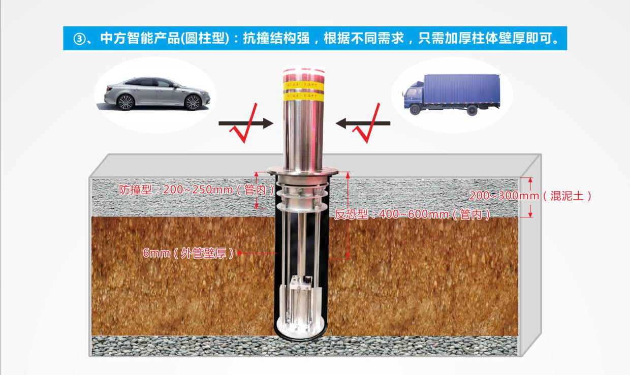 小型液压升降柱是一种以液压电机为动力单元的自动升降路桩,小型液压升降柱主要有三种应用----建筑(装饰),安全(抗冲击)和景观美化(周界突出)。所有护柱都能有建筑和景观美化上的公用,只在款式,形状和材质上有所区别。涉及到安全应用时,不同的护柱用来阻挡不同的物体。